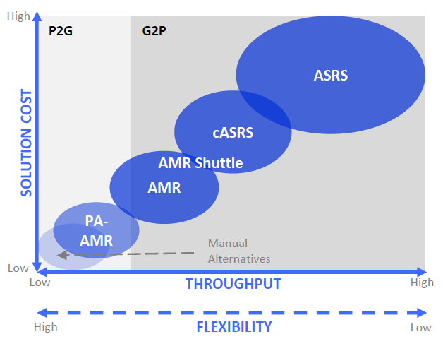 Lees meer over PA AMR (multi bot), Miniload, Shuttle systeem, cASRS en Verticale Lift Modules als G2P-oplossing.